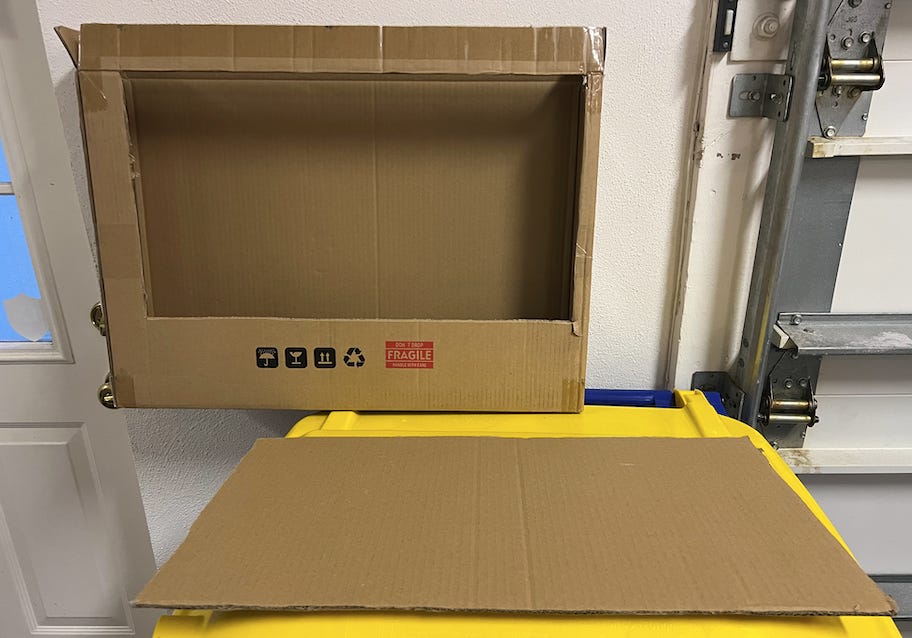 I used the shipping box to make a cardboard template and taped the lines where I needed to make my various cuts. I measured, checked, measured, checked, measured, and checked again (probably ten times) because I got only one shot at cutting it correctly and didn't want to screw it up.