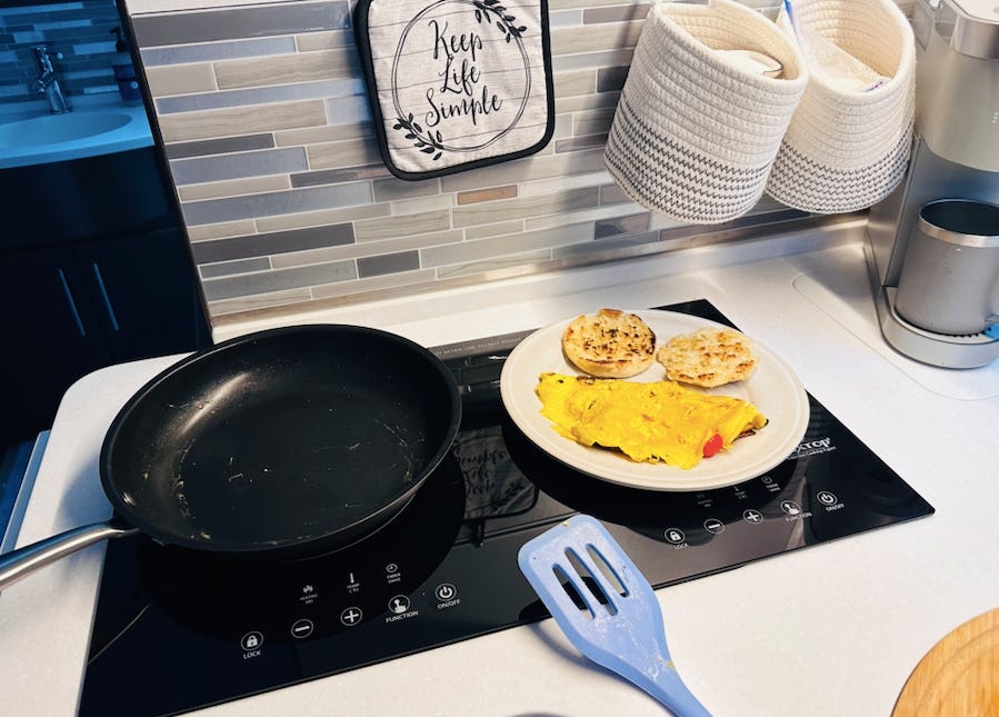 All of this takes me to the beginning of my Musing (and this morning's breakfast). It cooked hot, fast, and delicious, especially with my farm-fresh, Mother Nature-colored egg omelette (with Bela mushrooms, cherry tomatoes, smoked bacon, and Mexican four cheeses). We love our induction stove in our luxurious, off grid LTV motor home.