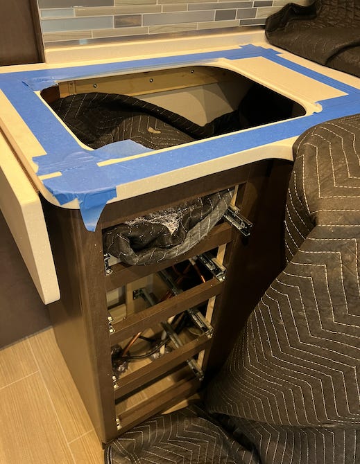 I removed the drawers under the stove, disconnected the propane and ignition line, and removed the four countertop fasteners; the stove slipped out easily. The height of the new induction stovetop cleared the top drawer (YAY). However, the width and length required that I cut the Corian countertop (YIKES).