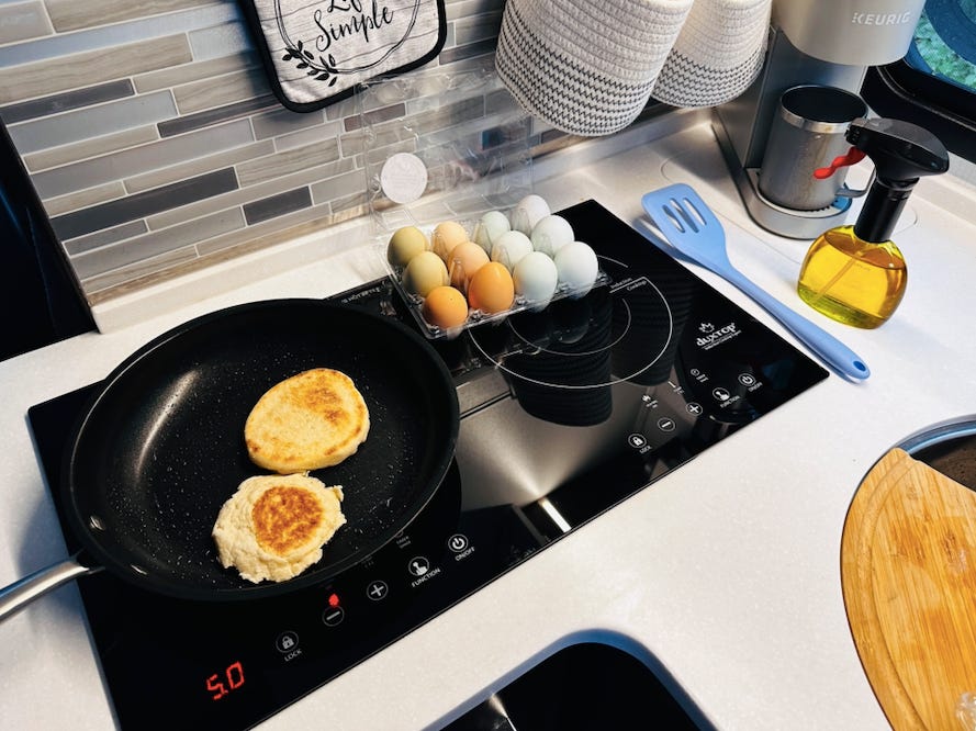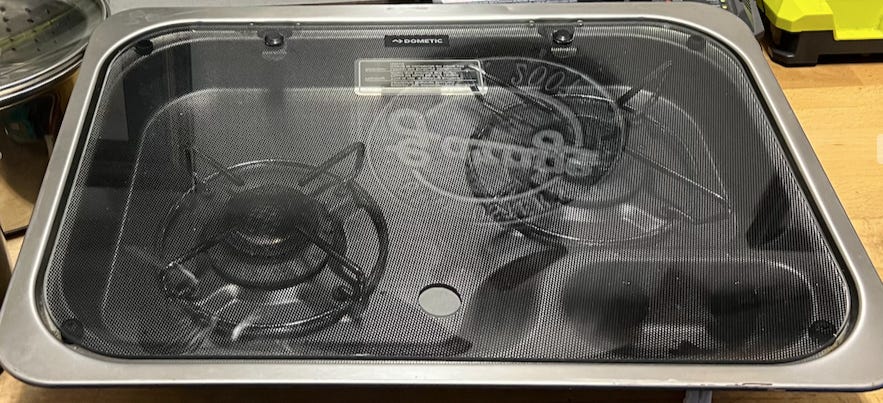 There are downsides to a propane stove in an RV. For example, the tremendous heat it produces in the galley/salon vs. BTU transfer to the pot/pan (induction has an 83% efficiency rating compared to propane at 30-35% efficiency), humidity from propane (can create condensation on the inside of windows,) the smell of propane fumes in a small/confined space, and the problematic cleaning of its many nooks/crannies. Also, propane is not a free renewable resource (like solar is).