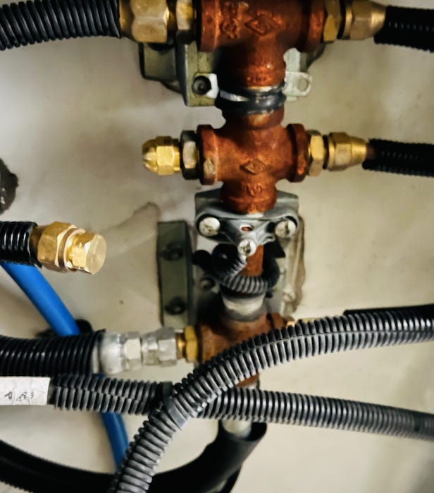 Once the new cooktop arrived, I knew I would need to disconnect the propane line from the existing stove at the propane manifold under the rig.